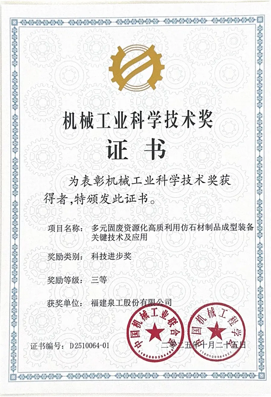 Hiljuti kuulutati ametlikult välja Hiina masinatööstuse 2025. aasta teadus- ja tehnoloogiaauhinna võitjate nimekiri. Fujian Quangong Machinery Co., Ltd. juhitud projekt "Vormimisseadmete võtmetehnoloogiad ja rakendused mitmekesiste tahkete jäätmeressursside suure väärtusega kasutamiseks simuleeritud kivitoodeteks" võitis kolmanda auhinna tehnoloogilise progressi eest. See auhind näitab täielikult selle kõrget tunnustustQuangong Machinery Co., Ltd.ettevõtte tehnoloogilise innovatsiooni võimalused ja insenerirakenduste saavutused tahkete jäätmete ressursside väärtusliku kasutamise ja intelligentsete vormimisseadmete valdkonnas simuleeritud kivitoodete jaoks.